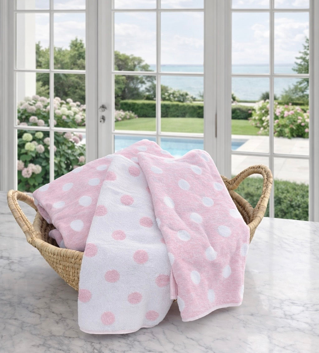 Introducing our Towel Collection. Made in Portugal we have a delightful range of towels to suit everyone. Our Spots towel is in a gorgeous soft pink with reverse colour scheme and is available in three sizes. View our towel range here.