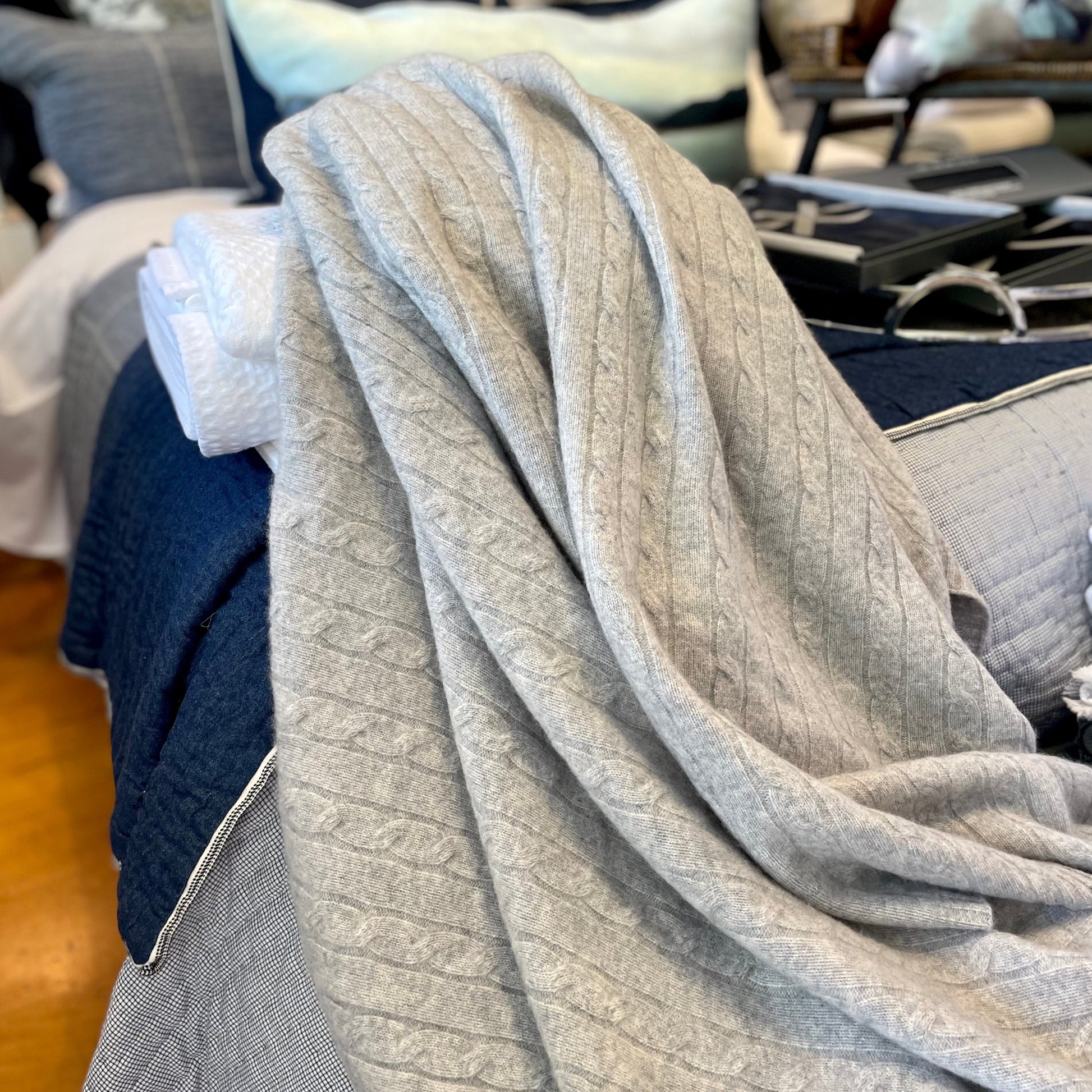 Wrap yourself up in our luxuriously soft sumptuous cashmere blankets. Our blankets are a generous sized cable knit made from 100% cashmere.